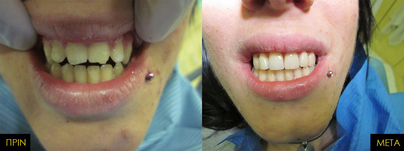 Full arch αποκατάσταση πάνω με όψεις πορσελάνης και ολοκεραμικές στεφάνες